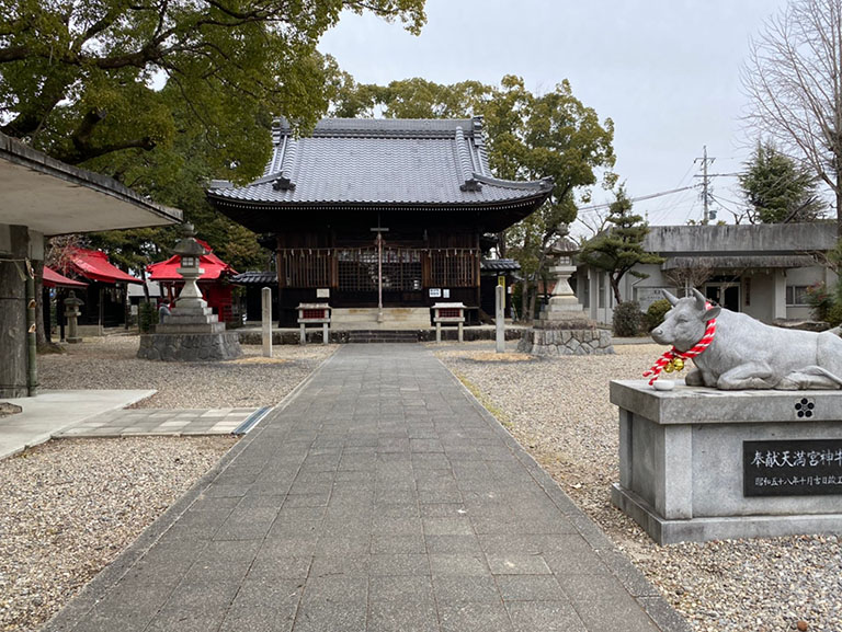 白山神社の横にある天満宮。参道まっすぐでわかりやすく、天満宮自体はこじんまりしていますが、ちょっと個性的な牛がドンと居ます。