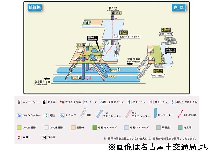 赤池駅は、地下2階に鶴舞線のホーム、地下1階に改札口がある構造です。