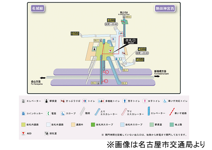 熱田神宮西駅は、地下2階に名城線ホームがある駅です。