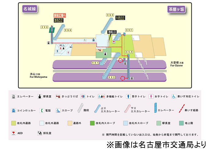 茶屋ヶ坂駅は、地下2階に地下鉄名城線のホームがある駅です。