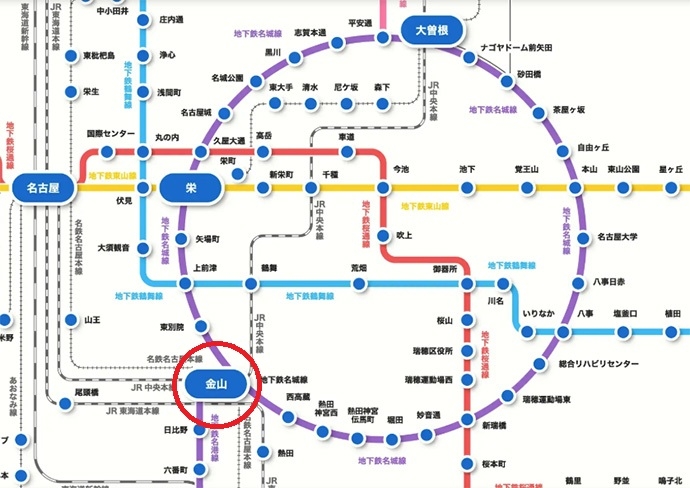 金山駅は地下鉄名城線・名港線のほか、名鉄やJRにも乗り換えが可能です。
