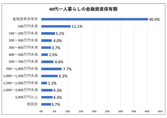 棒グラフを見ると、40代一人暮らしの金融資産額には、幅があることが分かります。