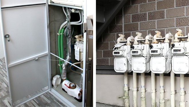 ガスのマイコンメーターは屋外にあります。(玄関横のパイプスペースや、1Fの給湯器周りや階段下など)