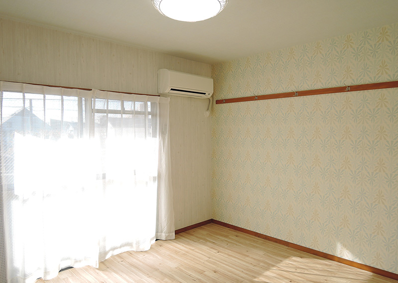 片側一面葉っぱの様なクロスで、他の面はホワイトの木目調クロス。