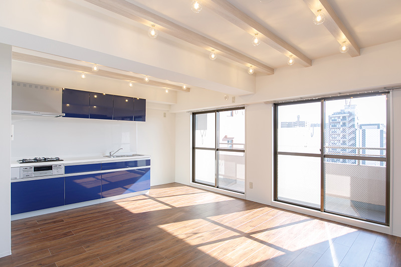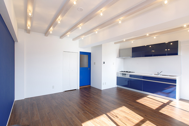 お部屋に合わせたブルーのシステムキッチン!