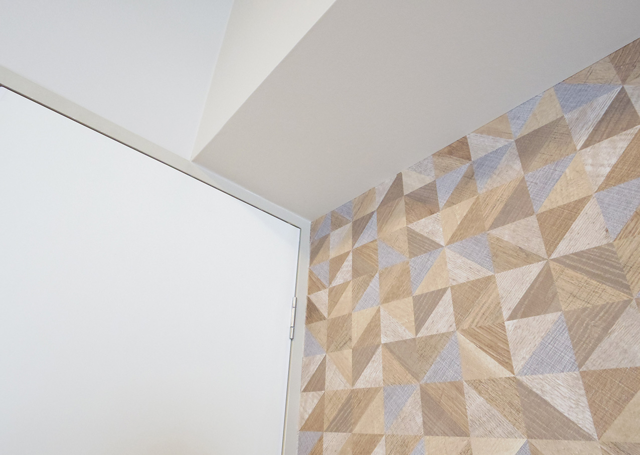 積み木を並べたような壁紙も、
